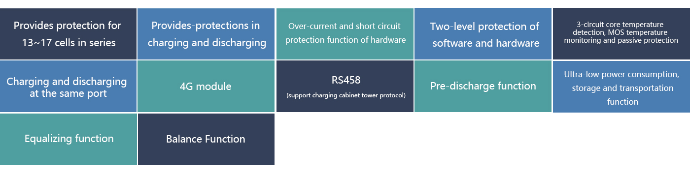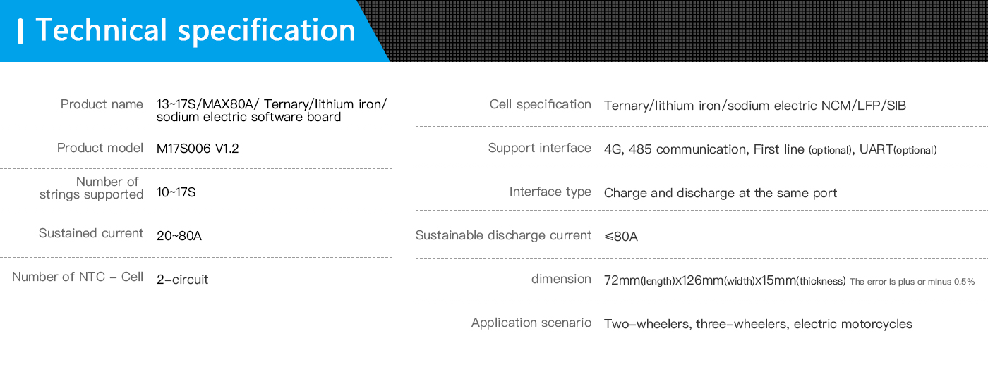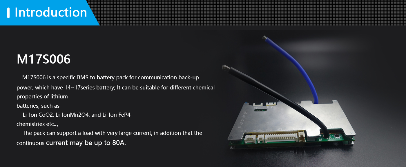 BP-M17S006 is a protection board solution designed by our company for 13~17 battery packs of power batteries; it can be used for lithium batteries of different chemical properties, such as lithium ion, lithium polymer, lithium iron phosphate, etc. This protection board has a strong load capacity and the maximum continuous current can reach 80A.