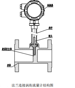 法蘭連接型渦街流量計(jì)的基本結(jié)構(gòu)主要是由表體、探頭、旋渦發(fā)生體、表?xiàng)U和轉(zhuǎn)換器等組成。