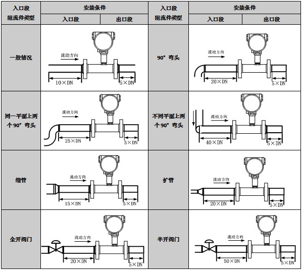 渦輪流量計(jì)對管道內(nèi)流速分布畸變及旋轉(zhuǎn)流是敏感的,進(jìn)入傳感器應(yīng)為充分發(fā)展湍流,因此要根據(jù)傳感器上游側(cè)阻流件類型配備必要的直管段或整流器,要求入口段和出口段直管段長度。