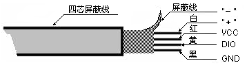 白色(或綠色)芯線接XS2接線柱的+端,屏蔽線接-端,紅色芯線接VCC(1腳),黃色芯線接DIO(2腳),黑色芯線接GND(3腳),探頭接線板對應連接;