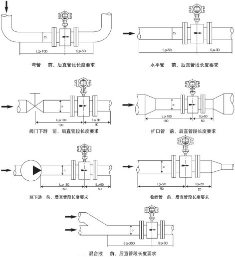 (5)流量計(jì)安裝場(chǎng)所應(yīng)避免有強(qiáng)磁場(chǎng)及強(qiáng)振動(dòng)源,如管道振動(dòng)大,在流量計(jì)兩邊應(yīng)有固定管道的支座。