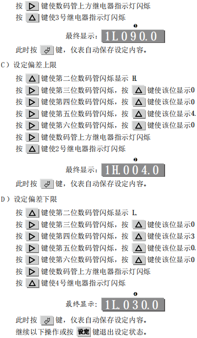 偏差上限是指超過上限的偏差值,實(shí)際報(bào)警值=上限+偏差上限。例: 上限為115.0℃,偏差上限為4.0℃ 實(shí)際報(bào)警值=115+4=119℃ 偏差下限是指超過下限的偏差值,實(shí)際報(bào)警值=下限-偏差下限。
