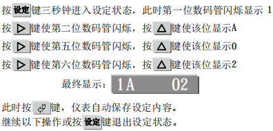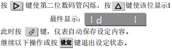 小數(shù)點(diǎn)位置的提示符是:d,在設(shè)定顯示范圍前,先設(shè)定小數(shù)點(diǎn)位置。小數(shù)點(diǎn)位置設(shè)定代碼范圍是0~3,其含義是0對(duì)應(yīng)個(gè)位〔第六位數(shù)碼管〕,1對(duì)應(yīng)十位〔第五位數(shù)碼管〕,2對(duì)應(yīng)百位〔第四位數(shù)碼管〕,3對(duì)應(yīng)千位〔第三位數(shù)碼管〕。從例二中我們看到顯示范圍是-100.0~100.0℃,小數(shù)點(diǎn)位置在十位上,也就是說在第五位數(shù)碼管上顯示,其對(duì)應(yīng)代碼是1。因此按以下操作進(jìn)行小數(shù)點(diǎn)位置設(shè)定。