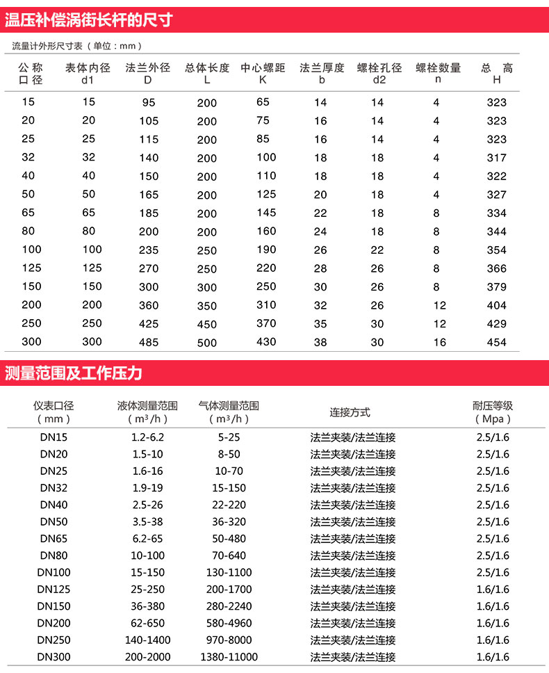 4、渦街流量計(jì)的下限流量取決于介質(zhì)的工況密度和運(yùn)動(dòng)粘度,其上限流量一般不受介質(zhì)壓力和溫度的影響,因此確定流量范圍只要確定實(shí)際可用的下限流量即可。計(jì)算出下限流量后,查流量范圍表即可確定相應(yīng)口徑。