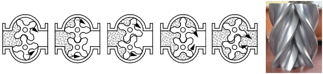 計量室內(nèi)主要有一對特殊轉(zhuǎn)子與蓋板構成的密封空腔作為流量的計量單位。轉(zhuǎn)子靠流量計進出口處的壓力差推動而旋轉(zhuǎn),從而不斷地把進口處的液體經(jīng)密封空腔計量后送到出口處。每轉(zhuǎn)流過的液體量是圖中密封腔的八倍,由密封聯(lián)軸器將轉(zhuǎn)子旋轉(zhuǎn)的總數(shù),以及旋轉(zhuǎn)的快慢傳遞給計數(shù)機構,便有指針顯示和字輪累積,即可知道通過管道中液體總量。在計數(shù)機構中還可以安裝脈沖發(fā)信器,即成了帶發(fā)信的流量計。