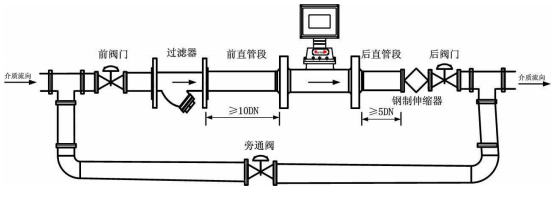 2、單向流情況下,超聲流量計(jì)前直管段的長(zhǎng)度至少要求10 倍的公稱通徑(DN),后直管段長(zhǎng)度至少要求5 倍的公稱通徑(DN)。雙向流情況下,超聲流量計(jì)的前后直管段的長(zhǎng)度至少要求10 倍的公稱通徑(DN)。