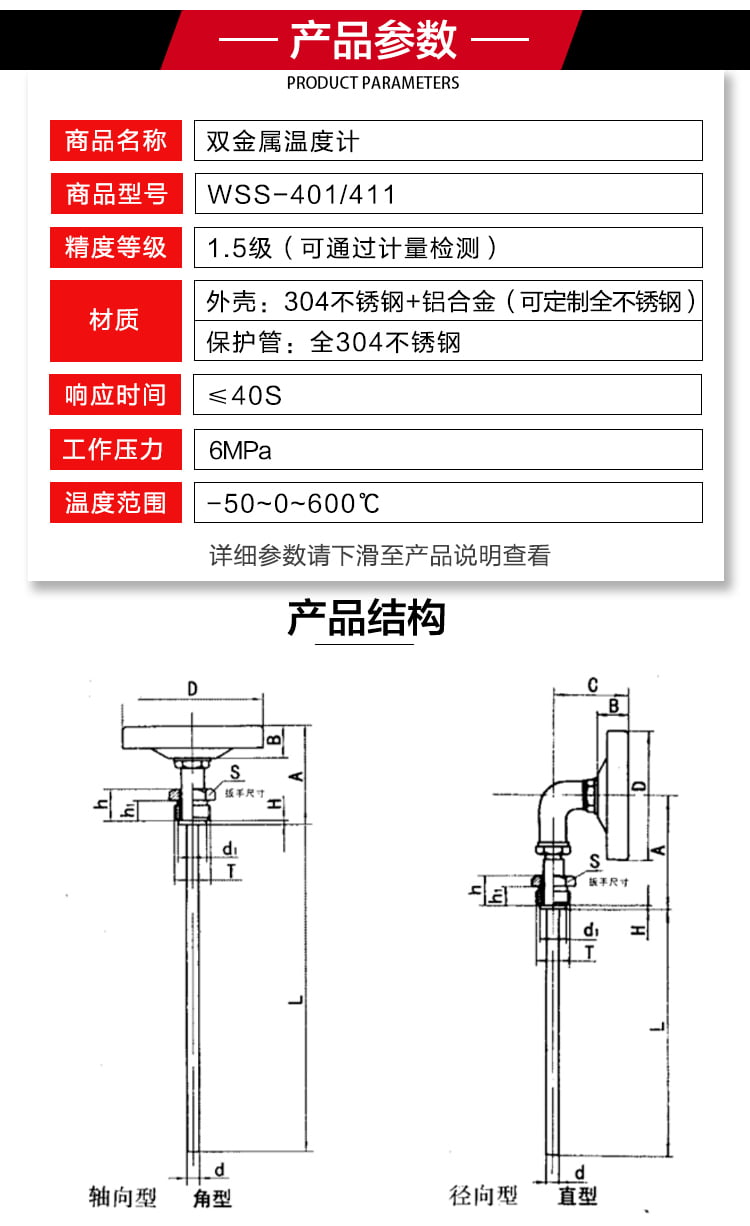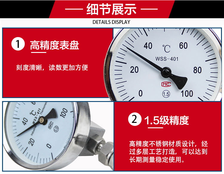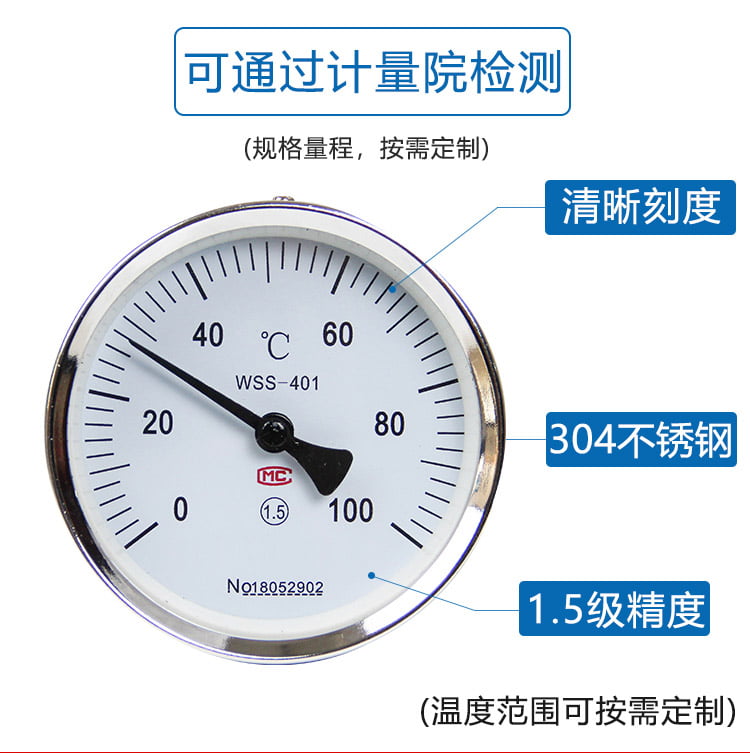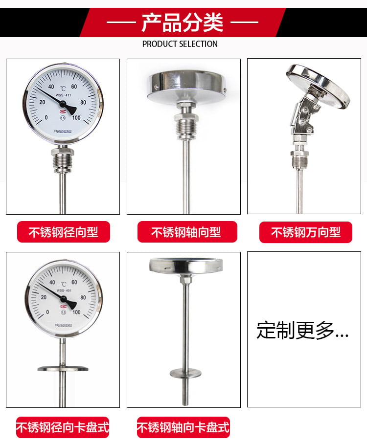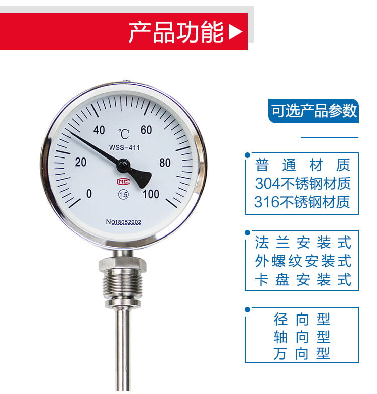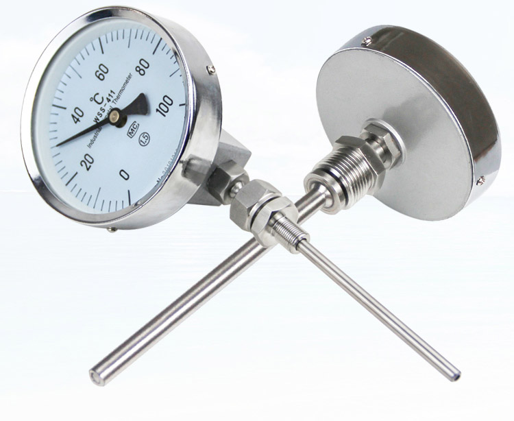 雙金屬溫度計有軸向型,徑向型,萬向型等表頭型號選擇.溫度計探桿長度可以根據(jù)客戶需要來定制?,F(xiàn)場顯示溫度,直觀方便安全可靠,使用壽命長;抽芯式溫度計可不停機短時間維護或更換機芯。軸向型、徑向型、135°型、萬向型等品種齊全,適應(yīng)于各種現(xiàn)場安裝的需要。