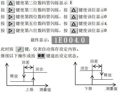 小長圖有紙記載儀上下限報警繼電器的觸點是給用戶聯(lián)接相應的控制電器[如電 磁閥]以組成控制系統(tǒng)時運用。為了避免在報警點左近繼電器觸點產(chǎn)生抖 動現(xiàn)象,儀表采用設定回差的辦法,以消弭繼電器觸點顫動。其提示符是:E