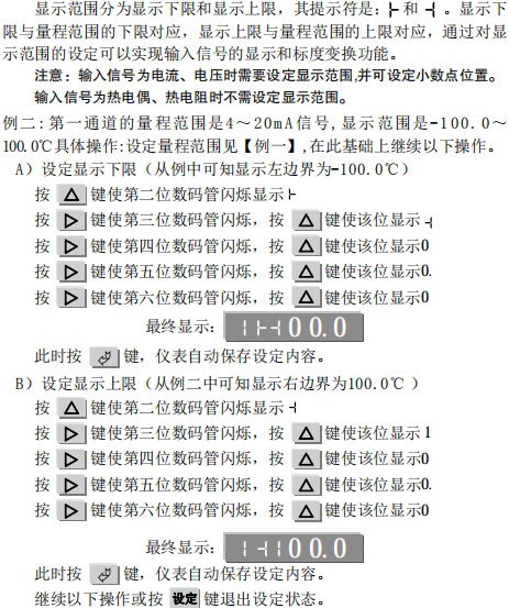 例三:**通道的量程范圍是4~20mA信號,顯現(xiàn)范圍是-100.0~100.0℃ 記載范圍是0.0~150.0℃。