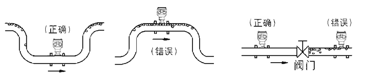 假如有氣泡九如丈量管,流量顯現(xiàn)會遭到影響,而且還會呈現(xiàn)丈量錯誤。當(dāng)流體中含有氣泡時,管路設(shè)計時必需避免氣泡積聚在丈量管中。假如在丈量管左近存在閥門,應(yīng)盡量將管布置在閥門上游,可防止壓力減小產(chǎn)生氣泡。