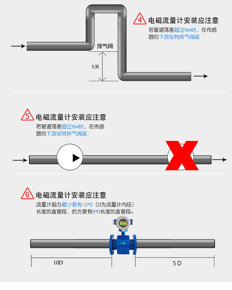 3、流量計(jì)的前方zui少要有5×D(D為流量計(jì)內(nèi)徑)長度的直管段,后方zui少要有3×D(D為流量計(jì)內(nèi)徑)長度的直管段;為方便安裝和拆卸,可在電磁流量計(jì)后加裝管道伸縮節(jié);